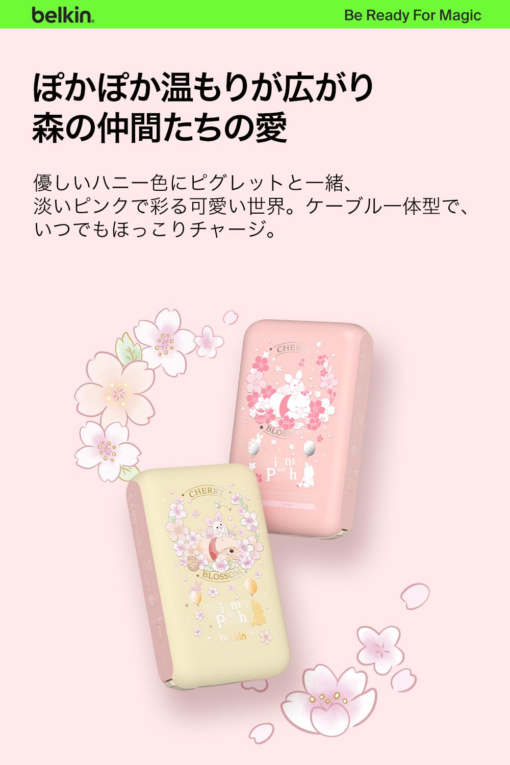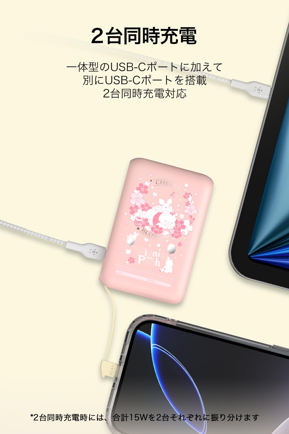 【ディズニー クマのプーさん】Belkin モバイルバッテリー(10000mAh 20W USB-Cケーブル内蔵)3C対応 CCC 最大20W PD高速充電対応 PPS対応 iPhone&Androidスマホ対応 2台同時充電 PSE認証 軽量&コンパクト 機内持込可能 アウトドア/災害/緊急用の便利グッズ メーカー保証2年 BPB021qcWP-DY