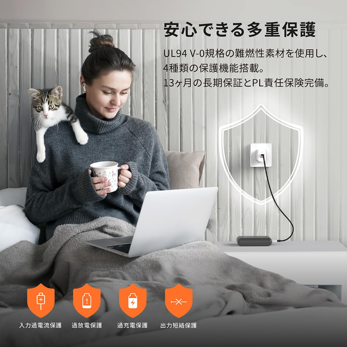 UL94 V-0グレードの難燃性素材を使用し、充電や保管中のチャージャーとデバイスを保護