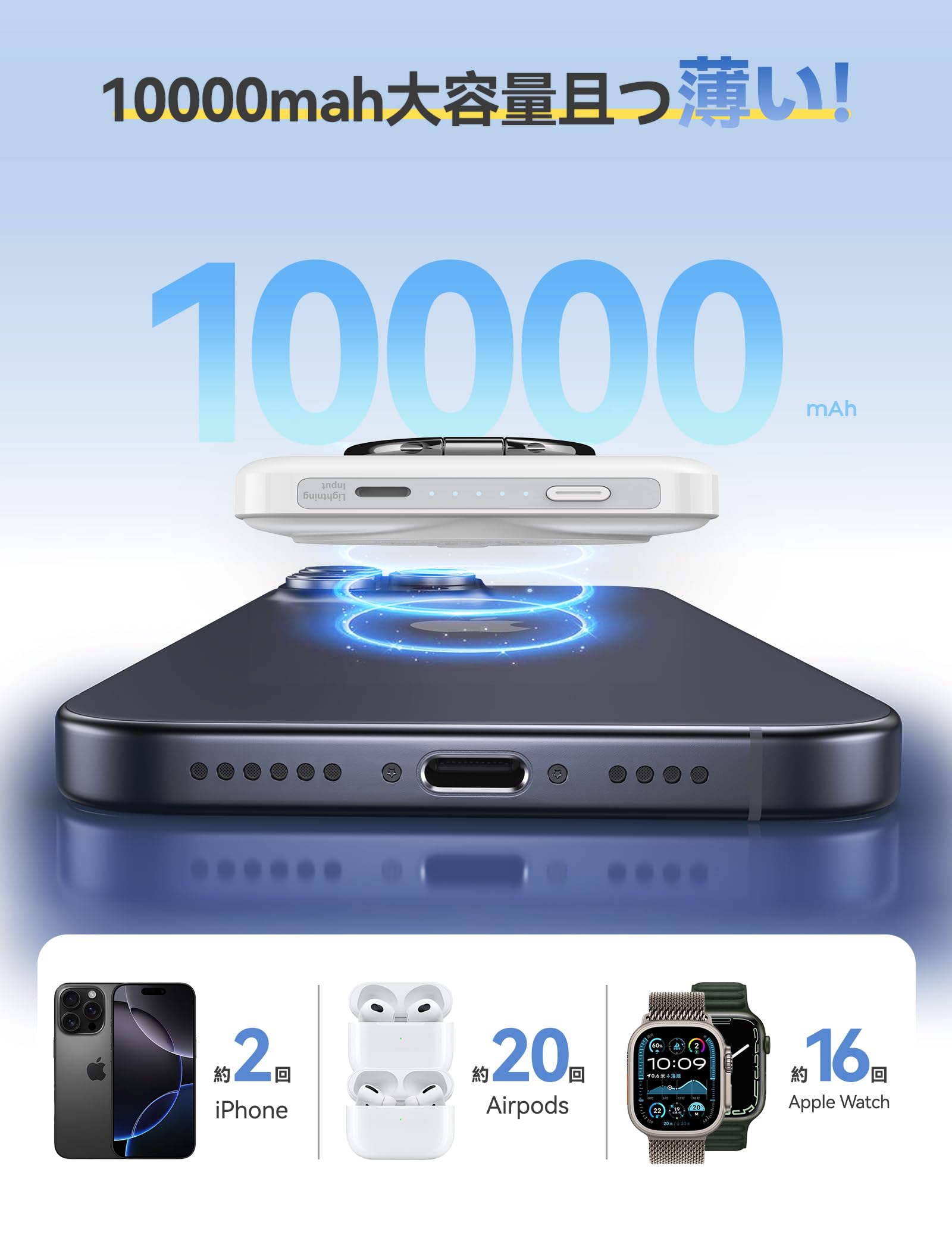 薄型モバイルバッテリーは、iPhone 16充電に2回、Apple Watch充電に16回とAirPods充電に20回が可能です。