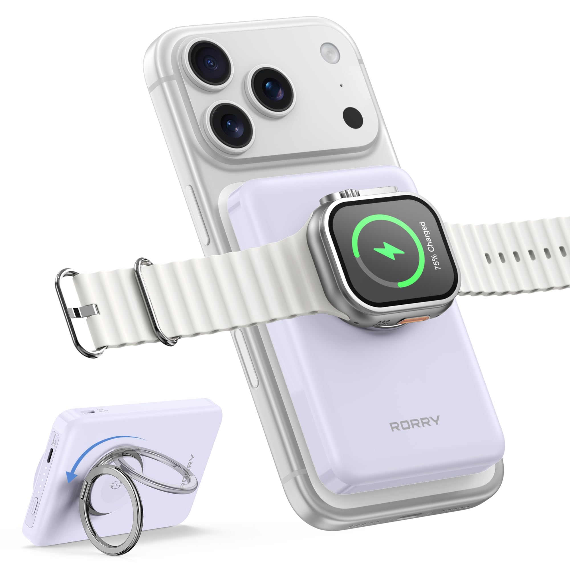 ■ 【3in1 ワイヤレス充電 モバイルバッテリー 最新osにも対応】ケーブルの煩わしさから解放します!iPhone、apple watch、airpodsをワイヤレス充電できる、多機能と小型化を兼ね備えたモバイルバッテリーが新登場します!RORRY for magsafe モバイル バッテリーは正面にiPhone 充電器、背面にapple watch 充電器をまとめて搭載され、2台同時ワイヤレス充電できます。