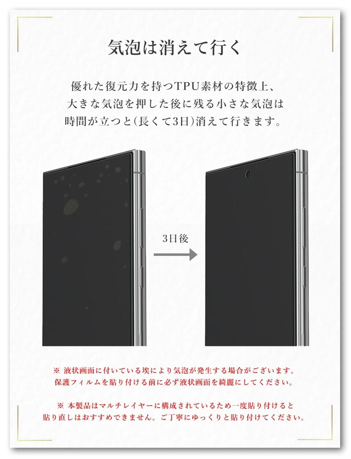 * 【説明書付き・専用ガイド枠付き】専用の貼り付けガイド枠が同梱されています。説明書をよくお読みいただき、ガイド枠を利用することで、手順に従って貼っていただきますと、初心者でも簡単に貼り付けます。すべての失敗の発生を防ぐことができて、ご心配を完全に解消します!グレードアップしたイオン自働吸着技術を採用して、初心者でもたった3ステップ、10秒で簡単に綺麗で貼り付けることができます。