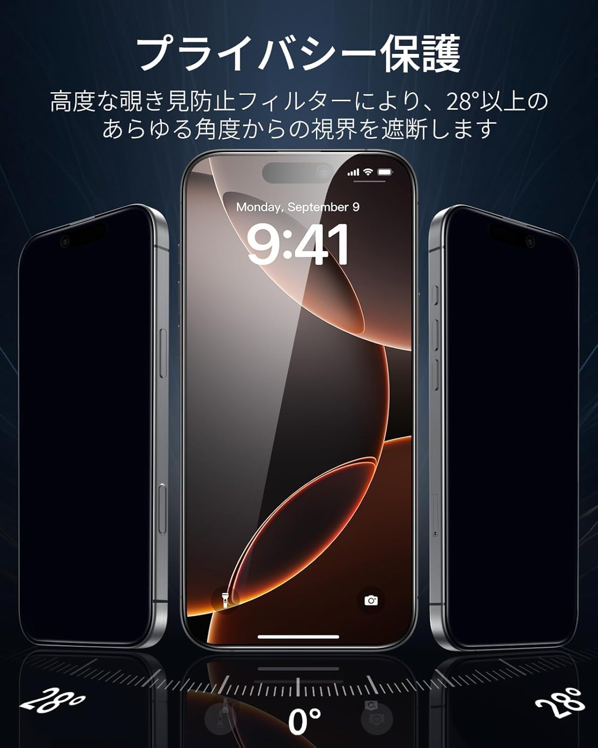 * 【覗き見防止,プライバシーフィルム】 本フィルムはiphone画面を横から覗かれることを防ぐ180度ブラインド仕様のプライバシー保護フィルムです,上下左右4方向の180度(前から约28度の視視角)のぞき見防止。正面から見る時はっきり見える、高透過率があり,側方から見るときにはブラインドを通して画面が徐々に暗くなる。画面の表示内容や個人情報は完璧に保たれ、周りからののぞきを心配せずにLINEやメールを交換できます。
