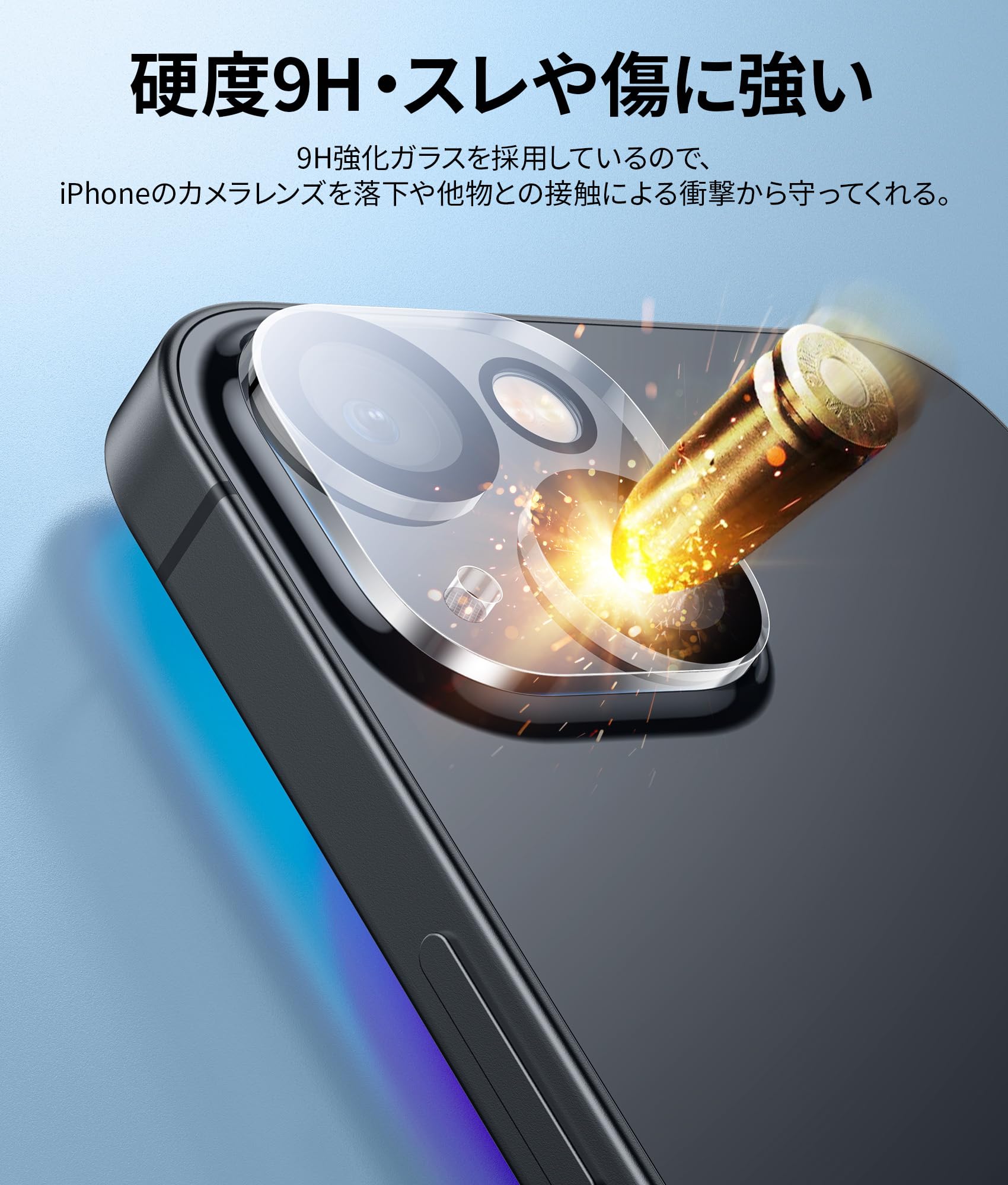 * 高品質素材製:強化ガラスを使用し、硬度は9Hの高硬度なので、ナイフや鍵などの尖ったものでも簡単には傷がつきません。カメラレンズ全面を守り、バッグやポケットの中で付いてしまう引っかき傷に対して高い耐性を持ちます。また、飛散防止設計により、万が一割れてしまっても、破片が飛散しなくなる保護フィルムです。