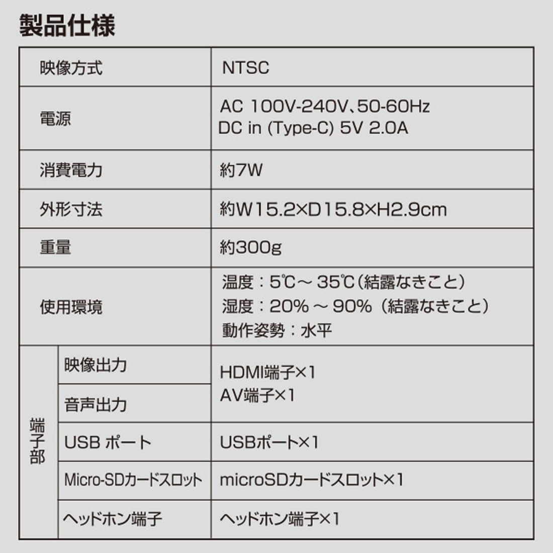 * 【商品仕様②】▪本体サイズ:幅15.2×奥行15.8×高さ2.9cm ▪本体重量:約300g ▪電源:AC100V-240V、50-60Hz DC in (Type-C) 5V 2.0A ▪消費電力:約7W ▪端子部:HDMI端子×1、AV端子×1、USBポート×1、microSDカードスロットル×1、ヘッドホン端子×1 ▪付属品:ACアダプター(Type C電源ケーブル)、取扱説明書、リモコン、リモコン用電池(単4形乾電池2本)、AVケーブル、HDMIケーブル