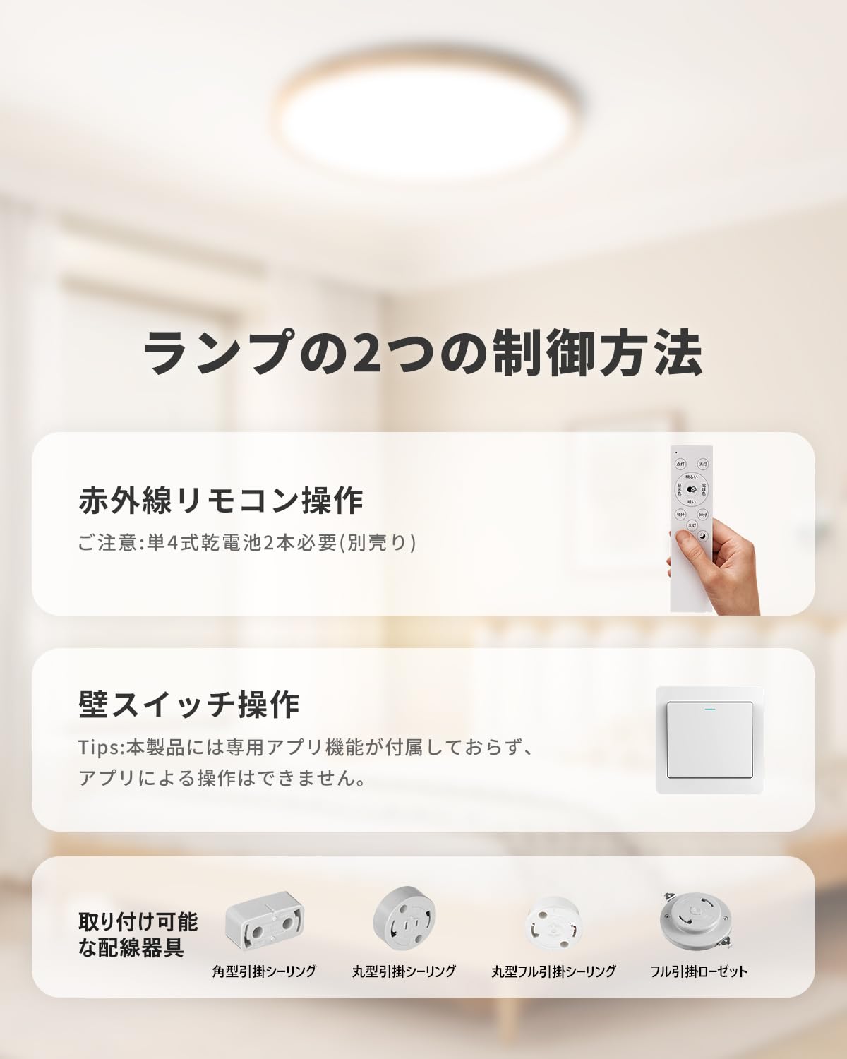 * 【3つの簡単な操作方法で自在にコントロール】 この製品は、リモコン、スマートフォン、壁スイッチの3つの方法で簡単に操作でき、照明の調整が手軽に行えます。専用アプリでは、調光、調色、タイマー設定を細かくカスタマイズでき、さらに便利に使用できます。壁スイッチを使うと、昼白色、昼光色、電球色、常夜灯をスムーズに切り替え、シーンに合わせて最適な光を提供します。
