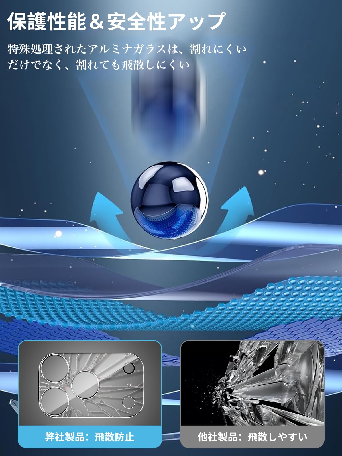 * 【9H旭硝子製保護フィルム】一番の保護性能を提供するために、このスマホカメラ保護フィルムは業界一番の9H硬度の旭硝子素材を採用しております。日常利用中で万が一スマホ落下するなどになってしまえば、保護フィルム貼り付けられては最大限にカメラレンズを保護できます。フィルムが割れてもガラス破片が飛散することを防げます。
