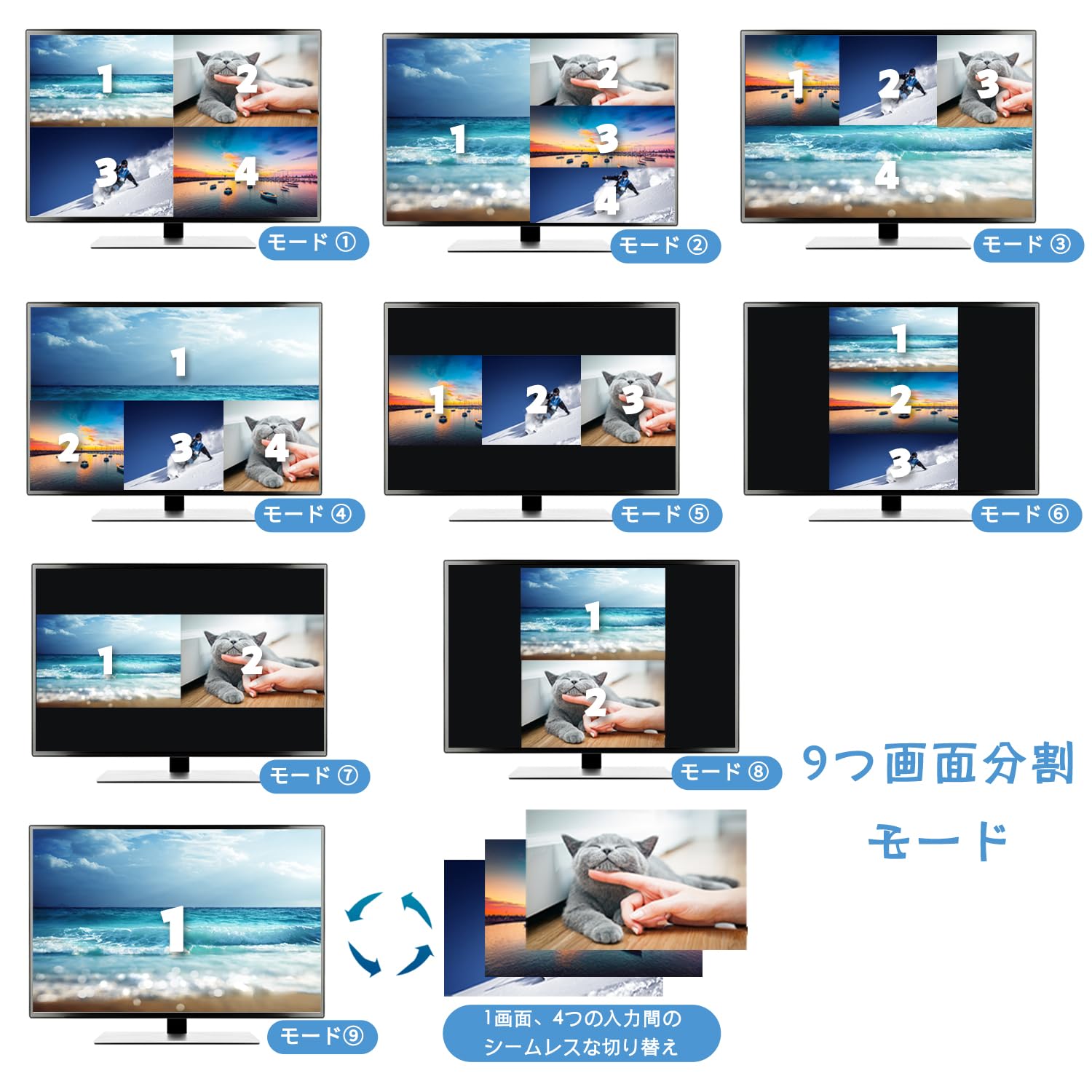 * 【シームレス切り替え&音声同期切り替え】①4路線の hdmi 信号のシームレスな切り替えに対応。4HDデジタルビデオ信号を同じ画面に表示でき、さまざまなビデオ分割があり、4HD入力信号を同期的にシームレスに切り替えます。②製品本体の【Audio Switch】ボタンで、音声同期の切り替えを実現します。