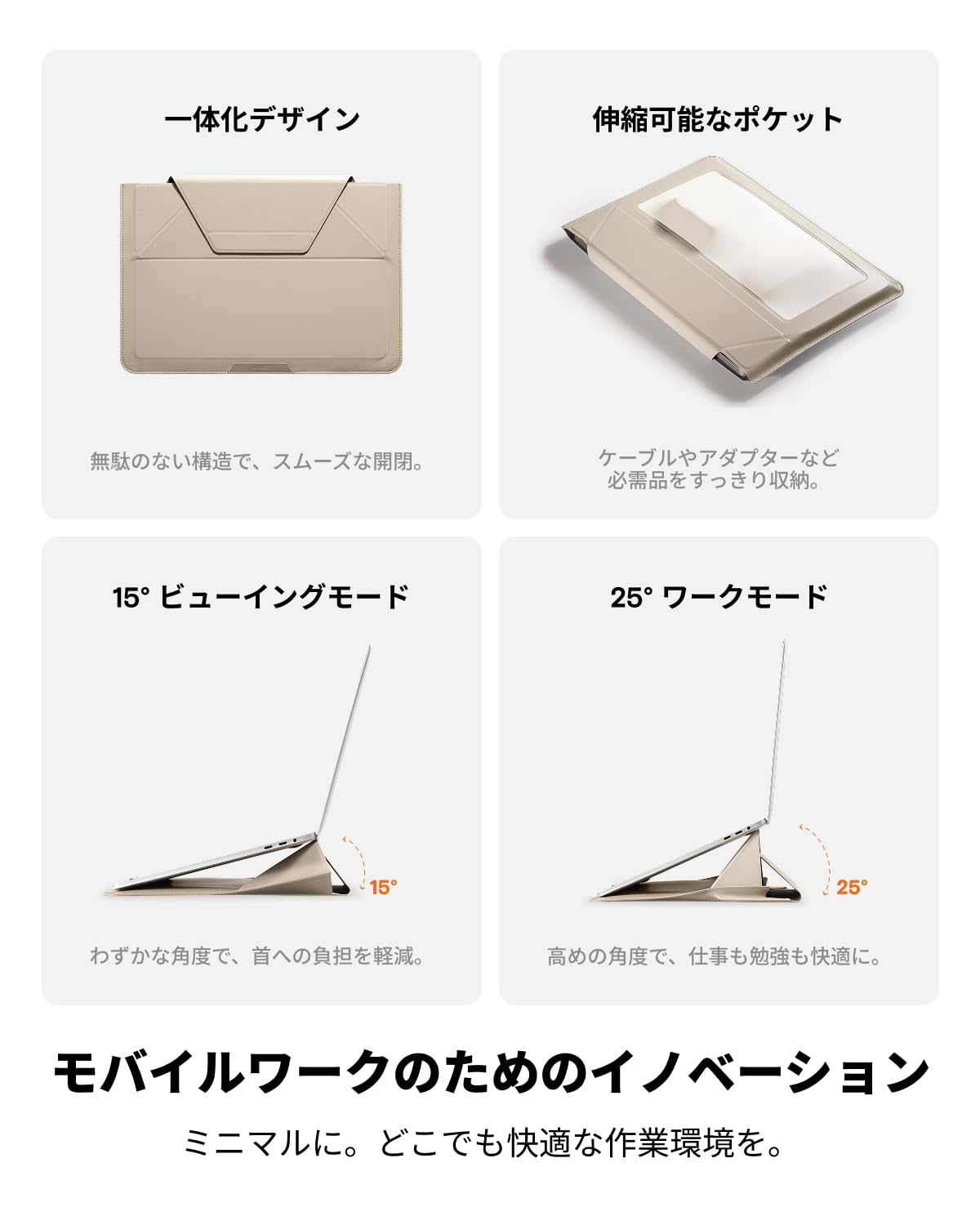 * 【1秒でPCスタンドに】MOFTスリーブケースは、収納・保護機能に加え、スタンドとしても活用できます。わずか7mmの薄さながら、15°と25°という2段階の角度調整が可能です。デスクワークはもちろん、膝上での作業など、どんな姿勢でもより快適な使い心地を提供します。