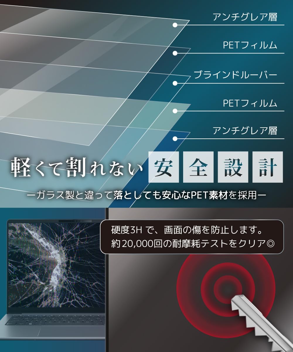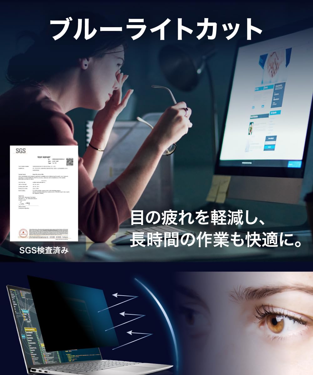 * [ ブルーライト半減 ] 私たちが子供の頃にはなかったノートパソコンのスクリーンから発せられる青色光。 毒性の強いブルーライトは眼精疲労や体内リズムへの影響が益々懸念されています。 本製品はブルーライトを約35%、紫外線を約99.9%低減。将来のことを考えるならブルーライトカット対応フィルムがオススメです。反射率5.8%とアンチグレアで光の映り込みもほとんどありません。
