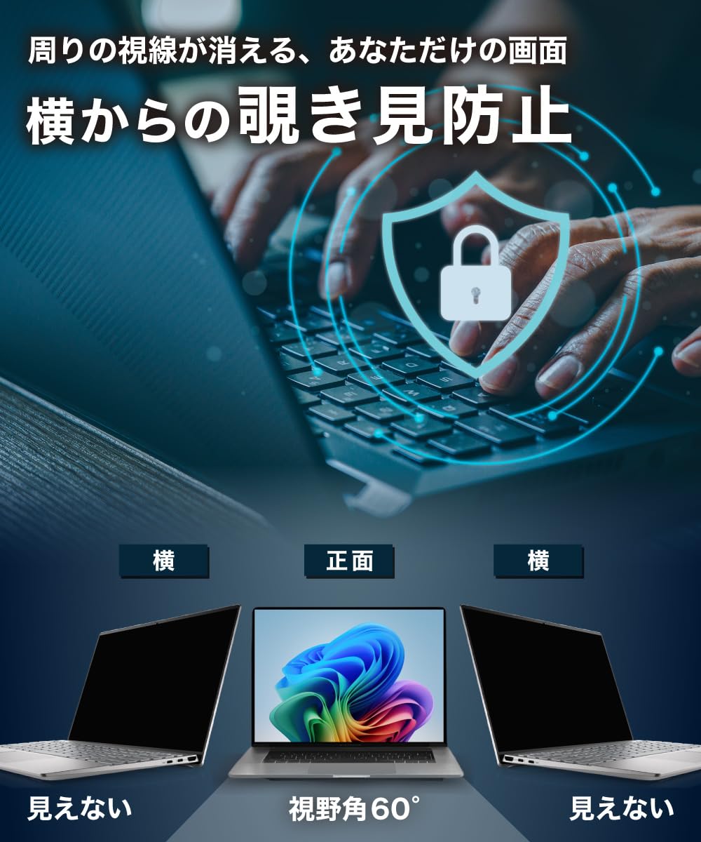 * [プライバシー保護] 視野角 60度、正面から見れると画面はクリアでも、隣の席からは真っ暗に映る偏光性を有する「覗き見防止フィルター」です。