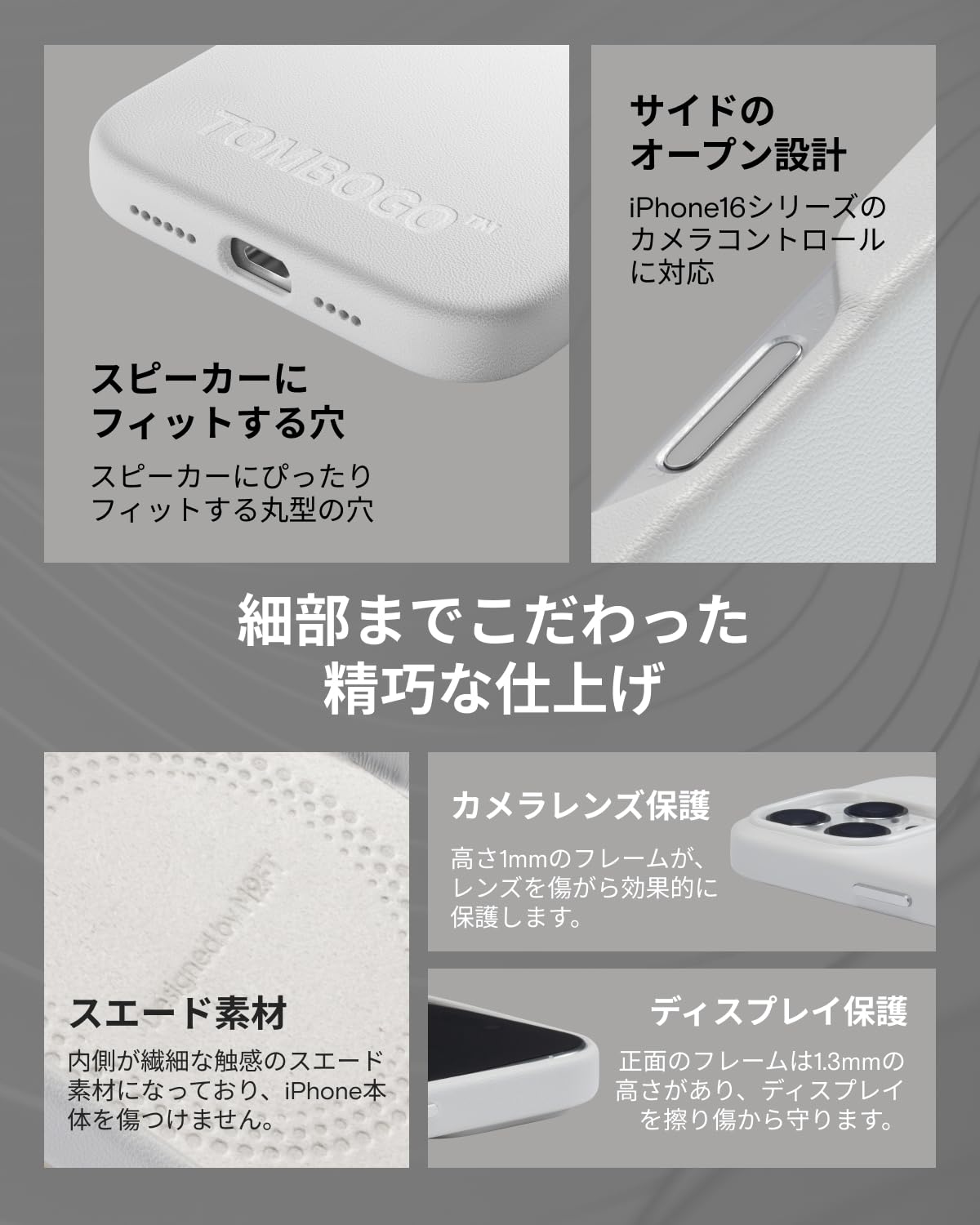 * 【細部までしっかり保護】iPhone 16 Pro Maxに設計されたカメラレンズ保護は、高さ1mmのフレームがあり、レンズを傷から効果的に保護します。 ケースの内側には繊細な触感のスエード素材を採用し、iPhone本体に傷がつくのを防ぎます。正面のフレームは1.3mmの高さがあり、ディスプレイを擦り傷から守ります。iPhone 16 Pro Maxのスピーカーにぴったりフィットする丸型の穴によって、外観の美しさをより高めるだけでなく、音質保護も向上させます。