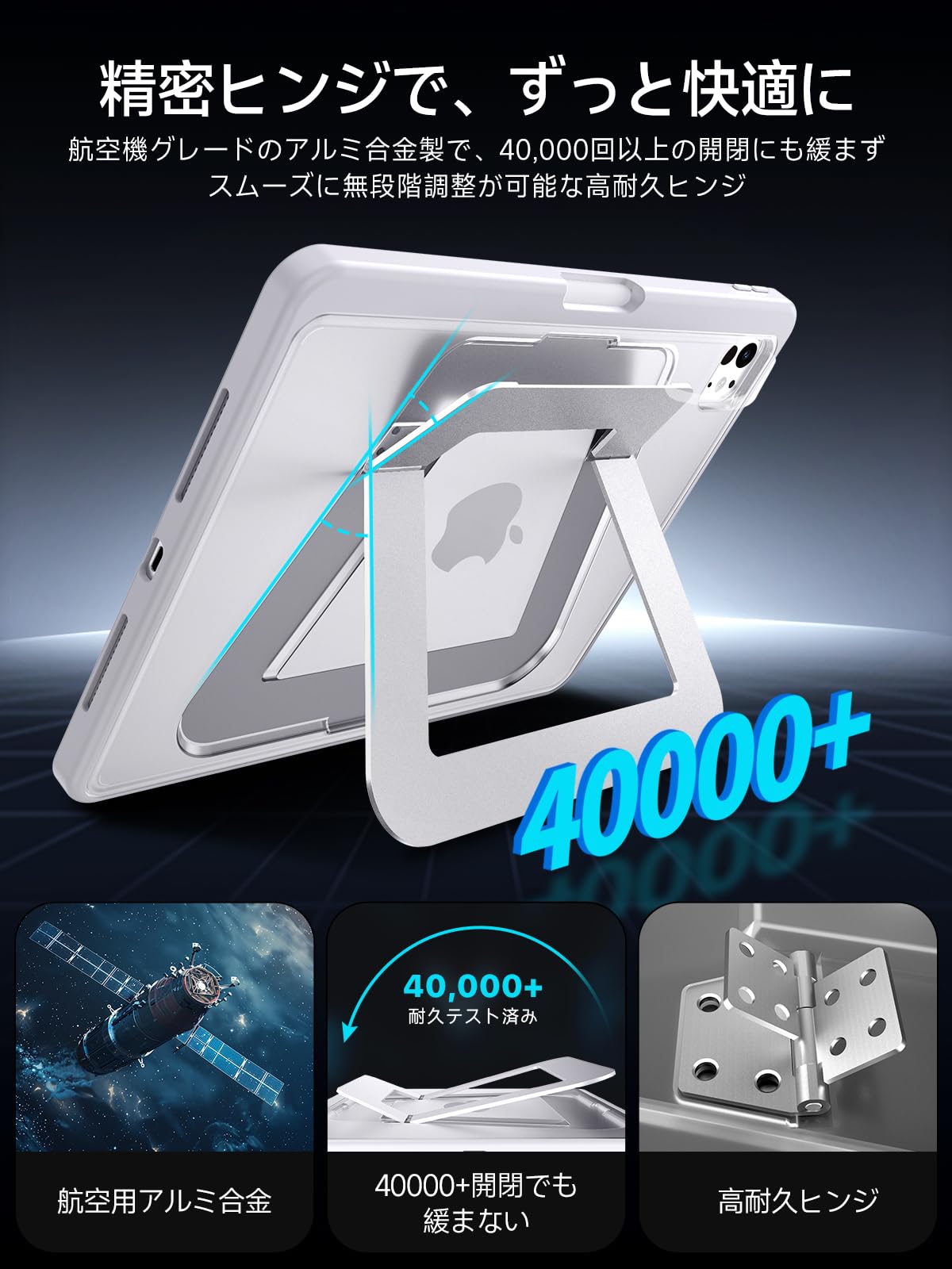 * 【安定感のある設計で、作業に集中】:iPad Pro 11インチ ケース m5は、日常使いに求められる「安定性」と「使いやすさ」を考えて設計されています。スタンド部分には航空機グレードのアルミニウム素材を使用し、独自の「トラホールド」ヒンジ構造により、約40000回の開閉テストをクリア。タイピングや動画視聴中でも、ぐらつきにくく、しっかりと自立します。従来のレザーケースで感じやすい不安定さを抑え、より快適な作業環境をサポートします。