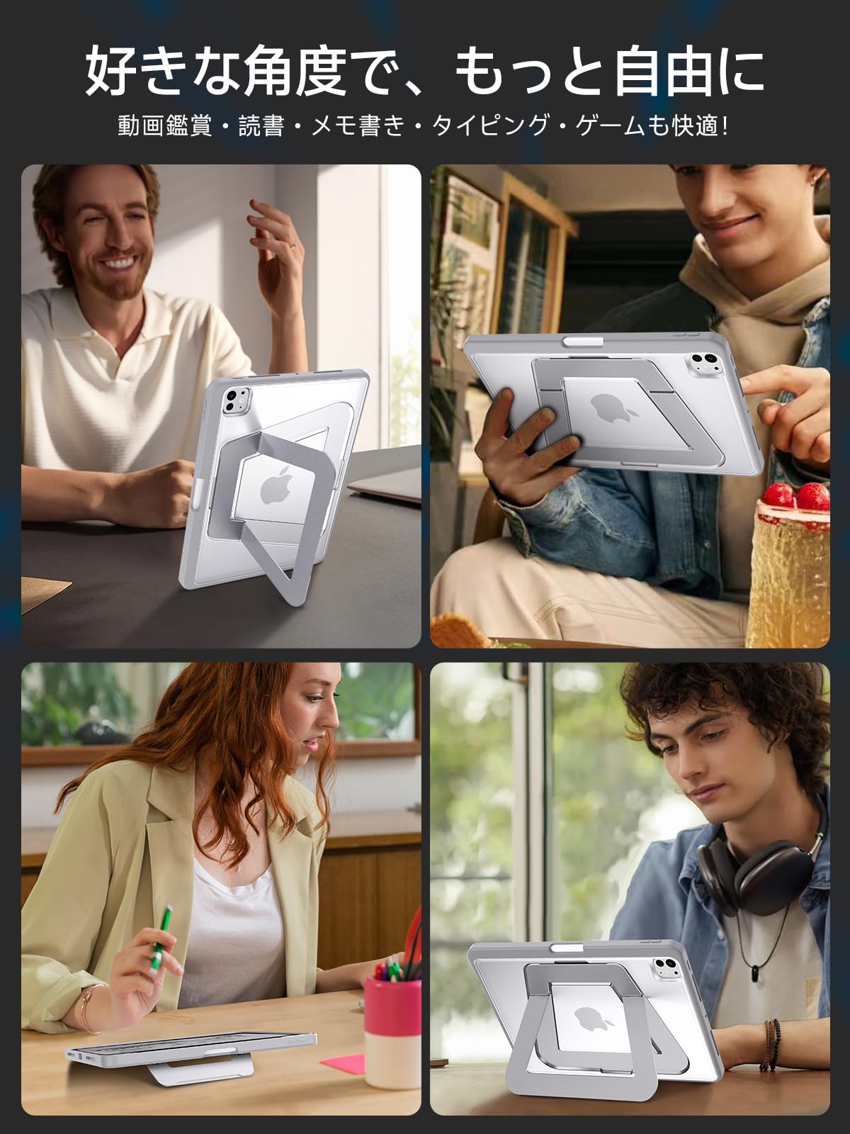 * 【自由に角度調整できる多機能スタンド】:独自の二軸スタンド構造により、使用シーンや姿勢に合わせてスムーズに角度調整が可能です。ショートスタンドは15〜40°の低角度に対応し、メモ書きやタイピング、イラスト作業にぴったり。ロングスタンドは30〜100°まで調整でき、動画視聴や資料作成などの作業にも快適に使えます。さらに、縦向き80°のスタンド機能も備えており、読書やビデオ通話など、両手を自由に使いたいときにも便利。無理のない姿勢で作業できるため、肩や首への負担も軽減されます。