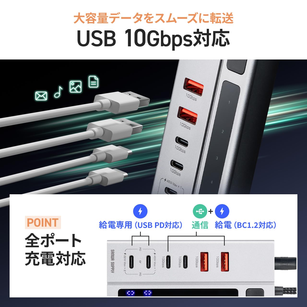 * データ通信 ポートはBC1.2に対応しているため、 スマートフォン や タブレット の充電が可能です。※PD出力には対応していません。