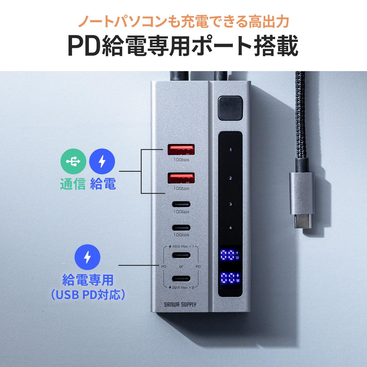 サンワダイレクト USBハブ USB-C 接続 4ポート USBC×2/ USB-A ×2 PD充電専用USB-C2ポート付 セルフパワー 最大PD45W対応 ディスプレイ付き 一括スイッチ付き USB3.2 Gen2 10Gbps ACアダプタ付 400-HUBC35GM